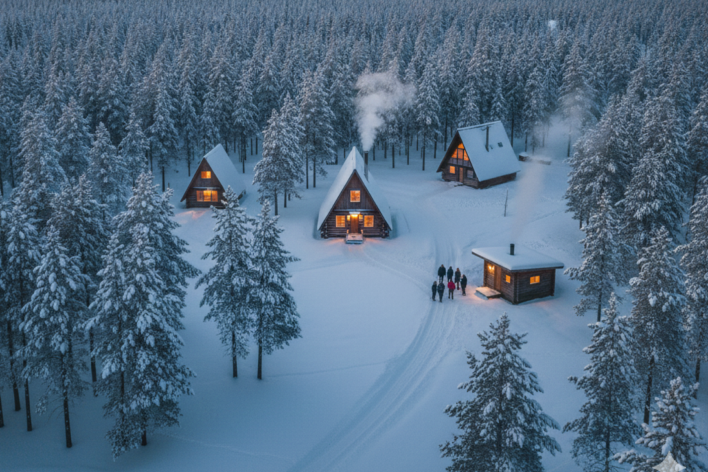 ​The cabins here, like the iconic Cabin No. 3 (the only one with a wood-burning stove) or the newly built Waldorf Nesstoria, are nestled deep in the jack pines. This is the place for “Nature Therapy.” You can spend your morning snowshoeing on over 25km of trails and your afternoon in the community’s wood-fired sauna. Most cabins are self-contained with kitchenettes, allowing you to hunker down with a good book and a hot cocoa while the aurora borealis dances above the trees.